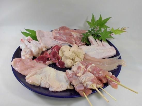 モモ肉 350g(2枚)、ムネ肉 350g(4枚)、手羽先 500g(約10本〜12本)、手羽元 500g(約10本〜12本)、モモ串 (5本)、肉団子 150g、ささみ 100g(約3本)、砂肝 150g