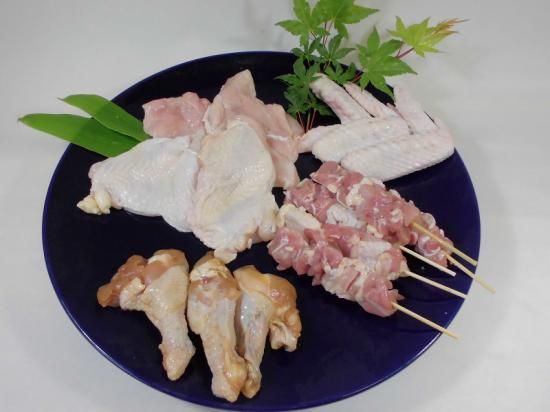 モモ串 (5本)、ムネ肉 350g(4枚)、手羽先 500g(約10本〜12本)、手羽元ピリ辛付け 350g(約7本)